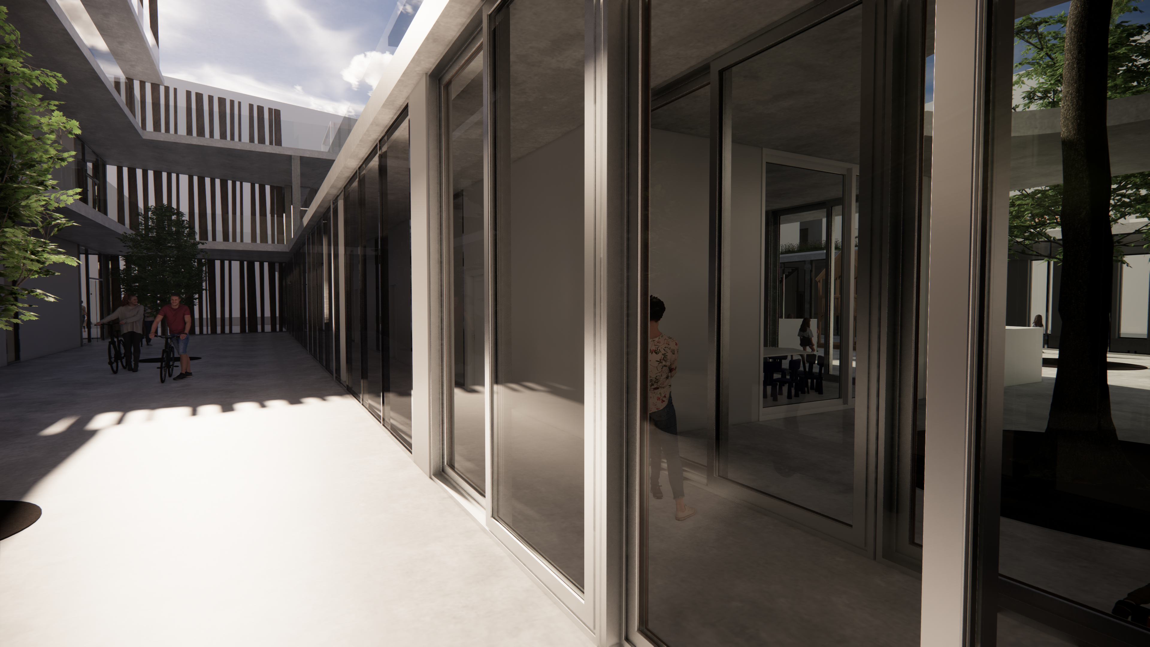 El proyecto nace de una idea de aulas y recorrido de estas basado en la conexión interior - exterior, creando espacios polivalentes los cuales dependiendo de la época del año pueden abrirse al completo hacia el exterior o cerrarse fisicamente aunque no conceptualmente. Su geometría emana de la continuidad de las fachas de los edificios colindantes, cediendo un espacio de entrada al usuario y potenciando la calle. Se pretende un juego constante e insconciente con la arquitectura del propio edificio por parte de los niños, aunque sea de manera inconsciente. Por ello, los patios se encuentran a diferentes cotas, permitiendo poder colonizar el edificio también en altura.